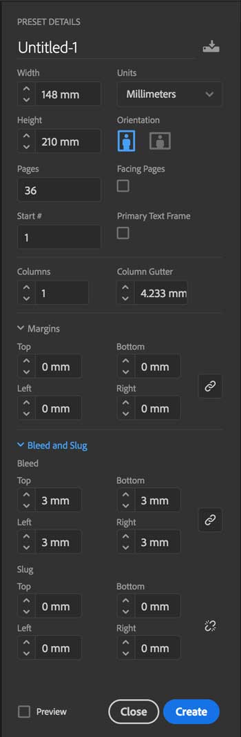 In preset details choose your preferred measurement units. There s no way to split up a spread or add pages to a spread when this feature is turned on. From the menu on the left hand side of the window select marks and bleeds to open up a new set of options. You simply don t see the bleed while working and really you don t need to.