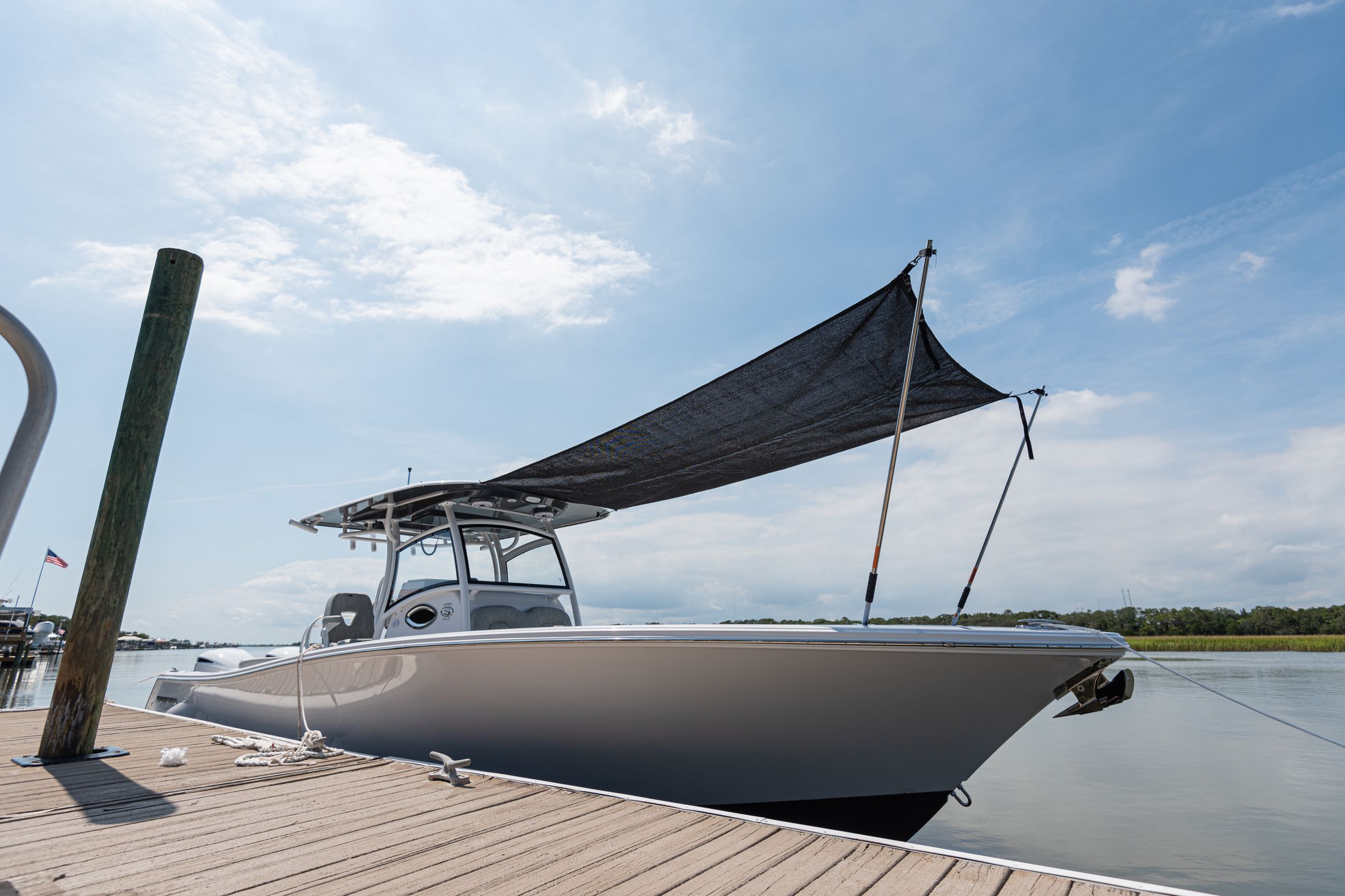 Boat ttop awning. There are no poles ropes or dangerous clutter to get in your way while fishing or just enjoying a day on the water. Built for cruising and deploys or retracts in seconds. It has a patented reflective coating on the topside to reflect up to 75 of uv heat while blocking out damaging uv rays. T top s boat shade kit bsk is a great way to protect you and your family from the sun.